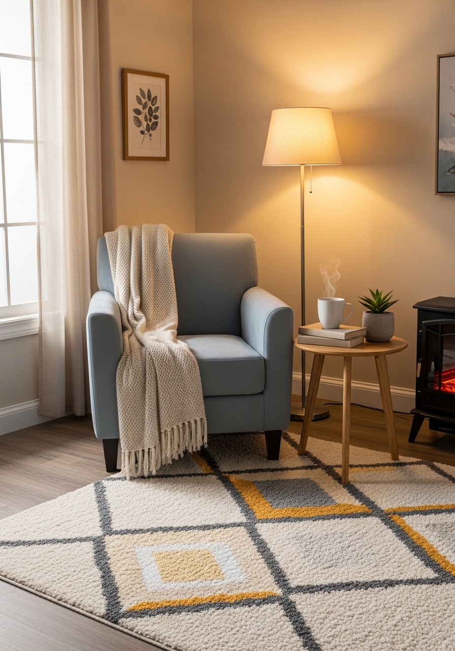 Create a dedicated sanctuary within your home by styling a cozy corner with a small area rug, a brilliant interior design technique for transforming underutilized nooks into functional, high-comfort zones. In larger, open-plan living rooms, a small rug—typically a 3×5 or 4×6—acts as a visual anchor for an accent chair, a floor lamp, and a side table, effectively “zoning” the area for reading, meditation, or quiet relaxation. By physically grouping these furniture pieces on a soft, tactile surface, you create a room-within-a-room effect that adds architectural depth without the need for walls or dividers. This home styling approach is highly effective for breaking up vast floor spaces and introducing a secondary layer of “hygge” to your floor plan. To achieve a designer-grade finish, choose a rug with a plush high-pile or a rich faux-fur texture to contrast with the more structured, lower-pile rug in the main seating area. This layering of functional zones ensures your living room feels both expansive and intimately curated. Whether you are highlighting a sun-drenched window or a quiet corner by a bookshelf, a zonal accent rug is the ultimate tool for adding character, warmth, and professional-grade intentionality to your home’s layout.