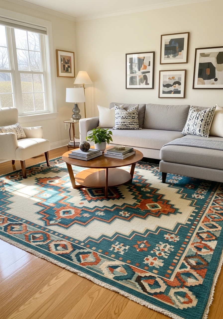 Transform your living room into a high-design sanctuary by highlighting a statement rug, a powerful interior design technique where the floor covering serves as the primary artistic centerpiece. In a neutral interior, a bold patterned or vibrantly colored rug provides the essential “soul” of the room, introducing personality, texture, and a definitive color palette that anchors the entire decor scheme. To execute this home styling strategy effectively, interior designers recommend a “less is more” approach with furniture; arrange your seating and tables around the rug’s perimeter or use glass-topped coffee tables to ensure the intricate motifs and craftsmanship remain visible. This layout shifts the focus from the architectural walls to the horizontal plane, creating a grounded yet visually stimulating focal point. Whether you select a hand-knotted Oriental rug, a modern geometric weave, or a high-texture abstract piece, a statement area rug acts as a canvas that dictates the room’s energy. By coordinating small accents—like throw pillows or ceramic vases—with the rug’s secondary colors, you achieve a sophisticated, professionally curated look that feels both intentional and daring. This approach is ideal for homeowners looking to make a massive impact with a single investment piece, proving that the right rug can truly “make” the room.