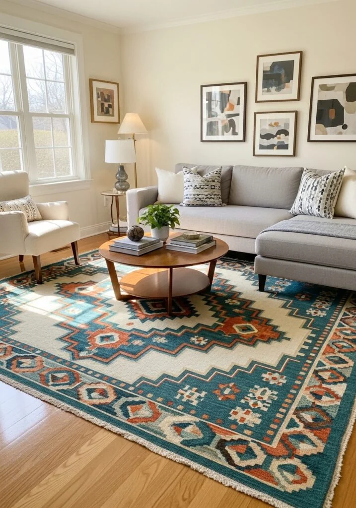 Transform your living room into a high-design sanctuary by highlighting a statement rug, a powerful interior design technique where the floor covering serves as the primary artistic centerpiece. In a neutral interior, a bold patterned or vibrantly colored rug provides the essential “soul” of the room, introducing personality, texture, and a definitive color palette that anchors the entire decor scheme. To execute this home styling strategy effectively, interior designers recommend a “less is more” approach with furniture; arrange your seating and tables around the rug’s perimeter or use glass-topped coffee tables to ensure the intricate motifs and craftsmanship remain visible. This layout shifts the focus from the architectural walls to the horizontal plane, creating a grounded yet visually stimulating focal point. Whether you select a hand-knotted Oriental rug, a modern geometric weave, or a high-texture abstract piece, a statement area rug acts as a canvas that dictates the room’s energy. By coordinating small accents—like throw pillows or ceramic vases—with the rug’s secondary colors, you achieve a sophisticated, professionally curated look that feels both intentional and daring. This approach is ideal for homeowners looking to make a massive impact with a single investment piece, proving that the right rug can truly “make” the room.