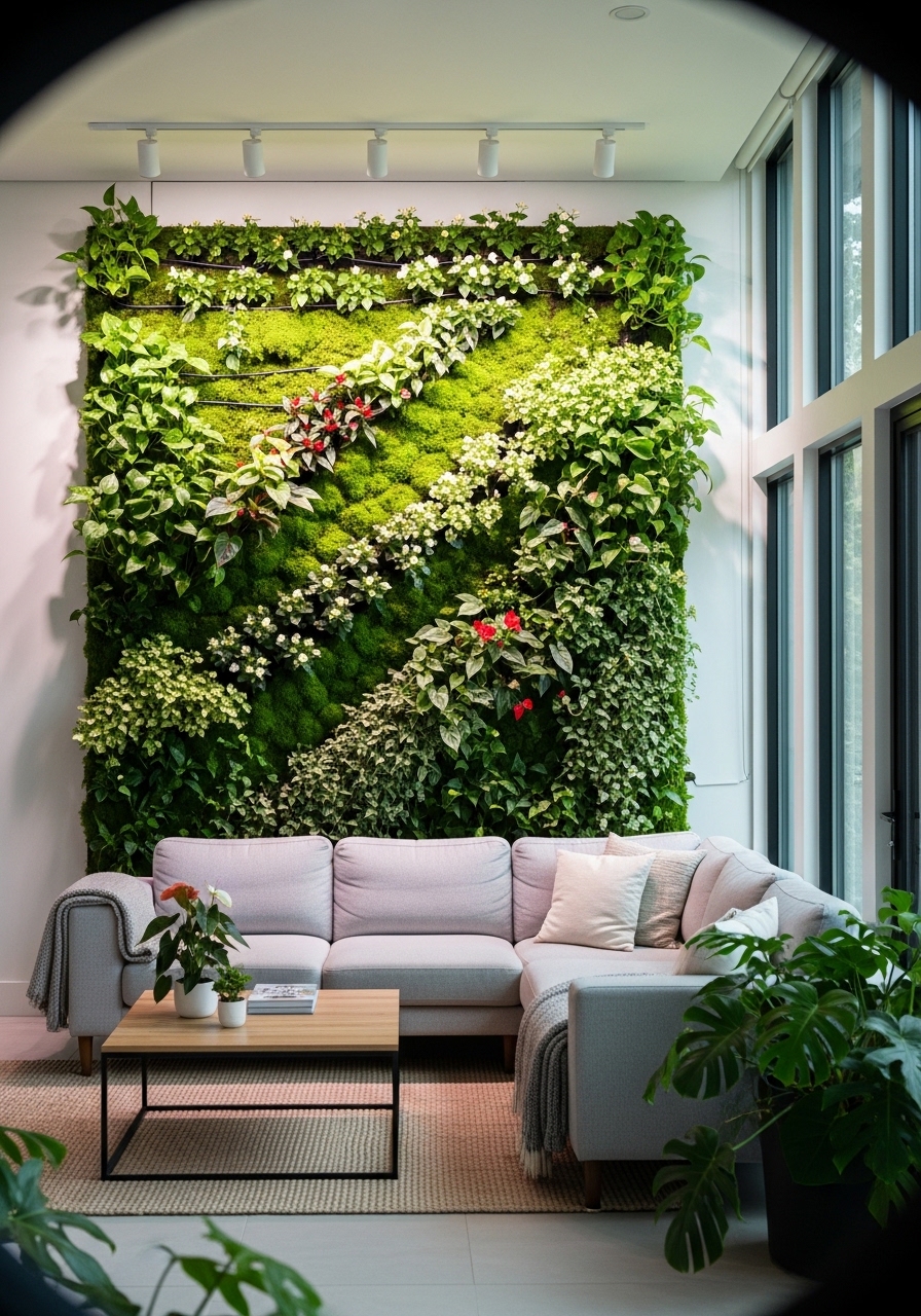 Transform your living space into a lush, breathable sanctuary by installing a vertical plant wall, a top-tier interior design trend that merges modern aesthetics with the restorative power of nature. Also known as a living wall, this vibrant decor solution allows you to maximize floor space by utilizing vertical surfaces to display an array of indoor greenery. For the most stunning visual impact, choose trailing house plants such as Pothos, English Ivy, or Heartleaf Philodendron; their cascading vines create a natural “waterfall” effect that adds movement and life to any blank wall. Integrating wall-mounted planters made of sustainable wood or handcrafted ceramics adds layers of texture, making this setup ideal for Biophilic, Boho, or Scandinavian design styles. Beyond the undeniable visual appeal, a vertical garden serves as a functional air purifier, significantly improving indoor air quality and reducing stress by creating a tranquil, calming atmosphere. Whether you are looking to create a focal point behind your sofa or refresh a minimalist home office, a vertical plant wall is the ultimate way to bring the outdoors in, combining environmental health benefits with a sophisticated, professional-grade design finish that instantly elevates your home’s character.