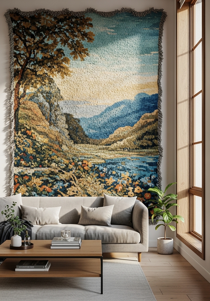 Elevate your interior design by hanging a large textile tapestry, a versatile and stylish solution for adding immediate warmth, softness, and acoustic depth to your living room. Unlike traditional framed art, a woven wall hanging or intricate macrame piece introduces a tactile organic element that balances the hard surfaces of modern furniture and drywall. This boho-chic decor trend is a favorite for creating a cozy, inviting atmosphere, especially when positioned as a focal point above a sofa, bed, or dedicated reading nook. For those favoring a Scandinavian or minimalist aesthetic, neutral-toned woven textiles provide subtle texture and sophisticated layering; conversely, bold, colorful tapestries serve as vibrant statement pieces in eclectic or maximalist spaces. Beyond its visual appeal, textile wall art is a functional design choice—it’s lightweight, easy to install, and simple to swap out whenever you want to refresh your seasonal home style. Incorporating high-quality fibers like cotton, wool, or jute into your vertical decor not only enhances the room’s “hygge” factor but also improves sound absorption, making your living area feel quieter and more intimate. By choosing a large-scale fabric wall hanging, you achieve a high-impact, artistic look that feels both curated and effortlessly comfortable.