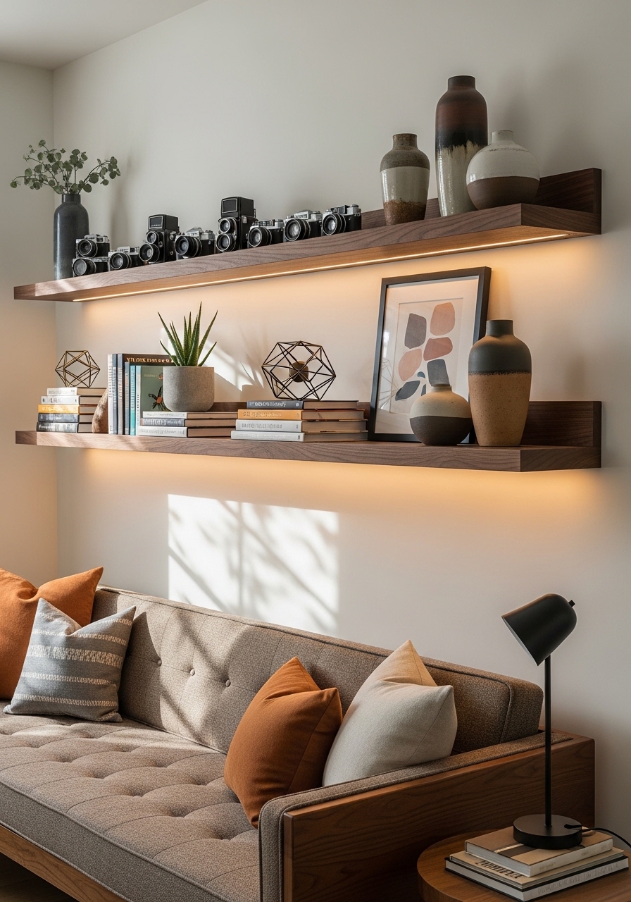 Floating shelves are a practical yet stylish solution for decorating blank living room walls. They provide vertical storage while also serving as decorative displays for books, plants, candles, and art pieces. Wooden floating shelves work particularly well in modern and Scandinavian interiors because they add warmth and texture. When styling the shelves, combine objects of different heights and shapes to create visual balance. For example, place books horizontally with a small plant or decorative object on top. Keeping the shelves minimally styled ensures the wall does not appear cluttered. This approach helps transform empty wall space into a beautifully styled display while maximizing functionality in your living room.