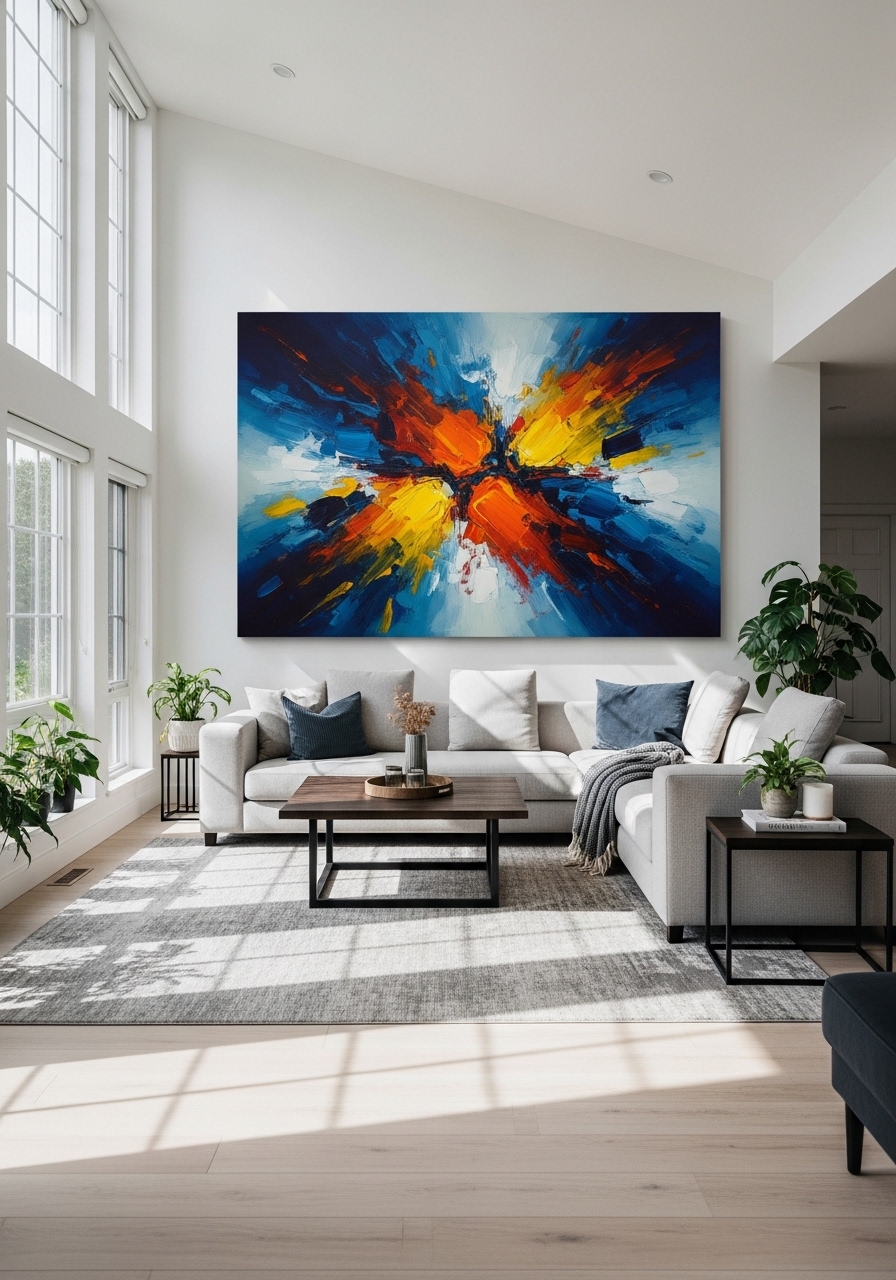 Oversized artwork is a powerful way to decorate a blank living room wall without adding too many decorative elements. A single large painting or abstract canvas can immediately draw attention and create a focal point in the room. Large-scale artwork works especially well above sofas, fireplaces, or console tables where it visually anchors the furniture. Choose artwork that complements the color palette of your living room to maintain harmony. Neutral abstract art adds elegance to minimalist spaces, while colorful artwork brings energy and personality. Investing in oversized wall art helps fill empty wall space effortlessly while creating a sophisticated and modern interior design aesthetic.