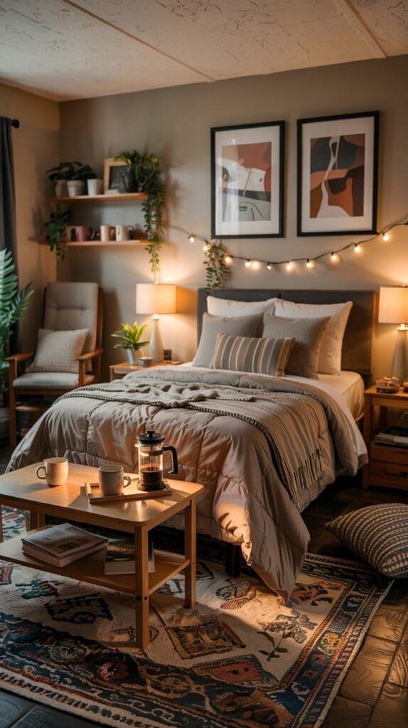 Indoor plants are another essential part of earthy bedroom decor. Even a single potted plant or a small arrangement of greenery can refresh the entire space. Plants add natural color, improve the overall mood of the room, and strengthen the connection to nature that defines earthy design. Paired with warm lighting, they help create a cozy and inviting environment perfect for relaxation.