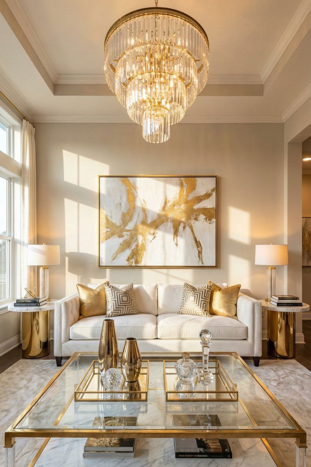 Gold accents instantly elevate a living room. Think gold-framed mirrors, side tables, or picture frames. These metallic touches catch light beautifully, creating a warm, inviting glow. Pairing gold with deep jewel tones on sofas or curtains amplifies luxury, making the space feel regal yet approachable.