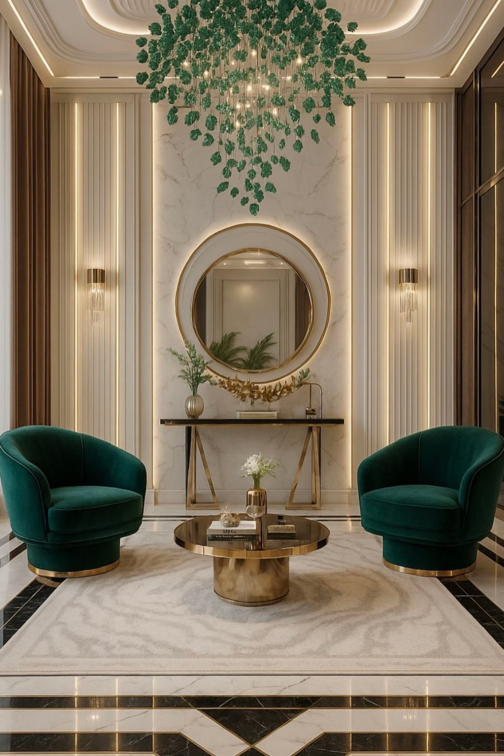 Art Deco revival isn’t afraid of color. Jewel tones like emerald green, sapphire blue, and ruby red paired with gold or black accents create drama and sophistication. Contrasting palettes, like black-and-white or navy-and-brass, make a strong visual impact while keeping interiors chic and timeless.