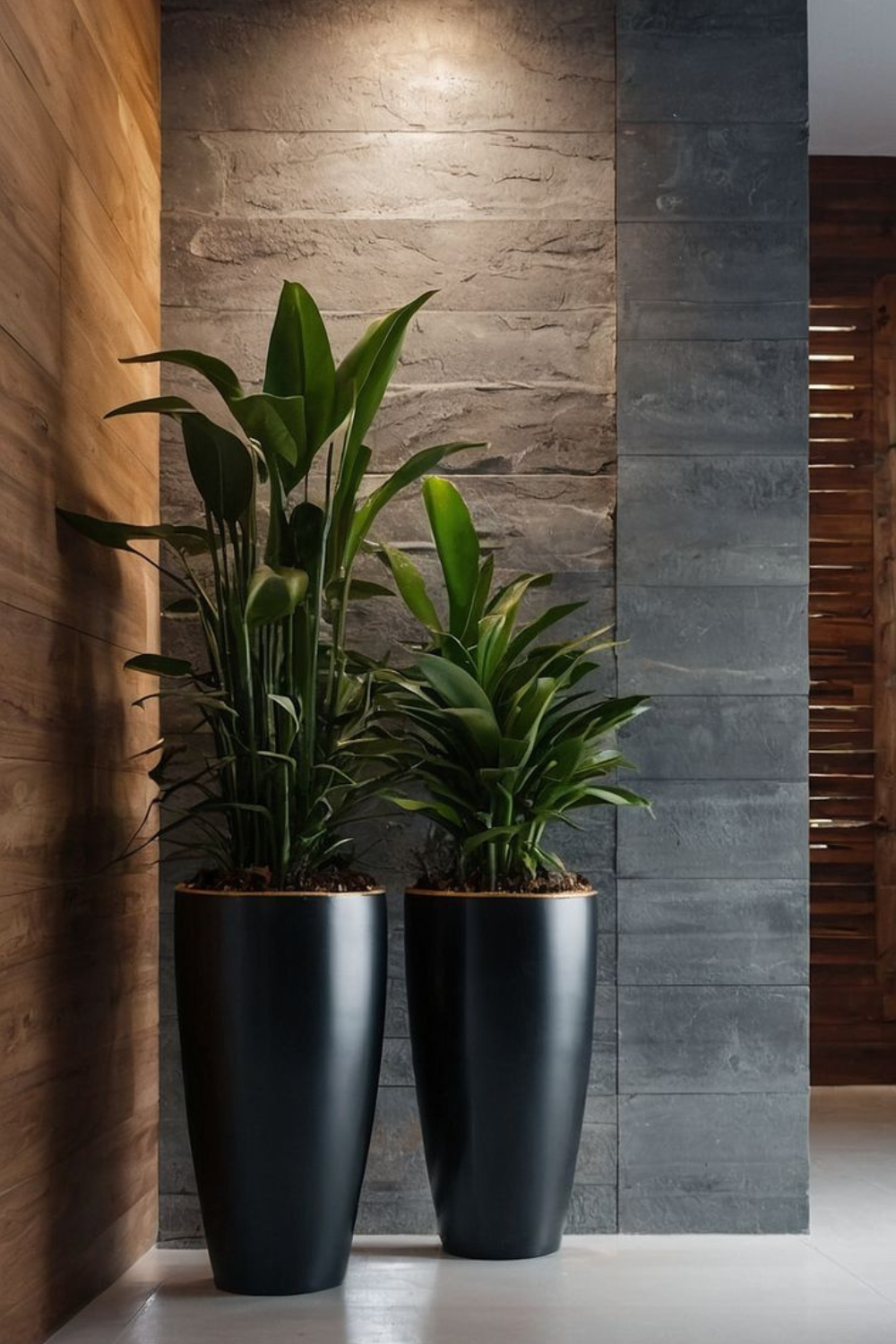 Adding greenery softens geometric and metallic spaces. Sculptural plants in gold or black pots bring freshness and life, balancing opulence with natural beauty.