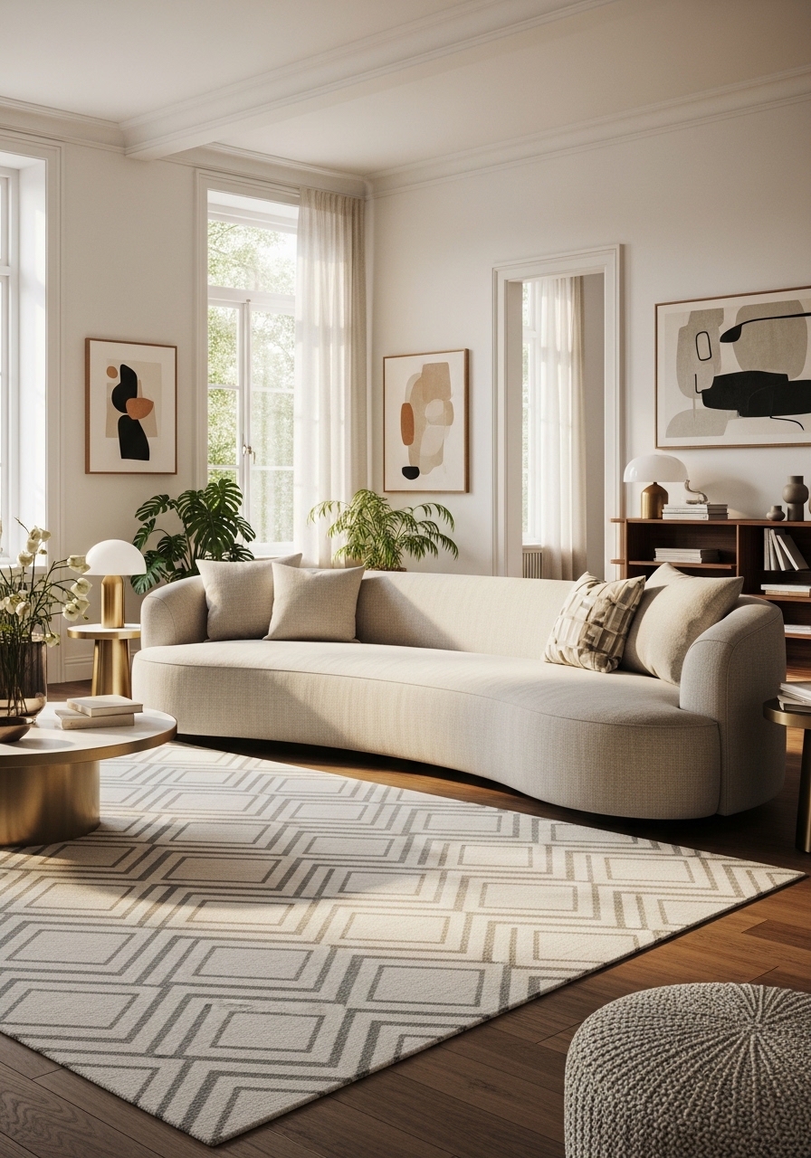 Anchoring your living space with a geometric rug in light summer shades is the ultimate strategy for defining a sophisticated Summer Neo-Deco foundation. To master this look, select a low-pile textile in airy tones like cream, sun-bleached sand, or muted coral to maintain a breathable, cool-underfoot feel. Prioritize Art Deco-inspired patterns—such as subtle honeycombs or interlocking arcs—to reinforce architectural symmetry without visual clutter. Ensure the rug’s proportions allow all furniture legs to rest comfortably on the surface, creating a cohesive, structured island. This tonal rug styling provides a polished, high-end base that feels both expansive and intentionally curated.