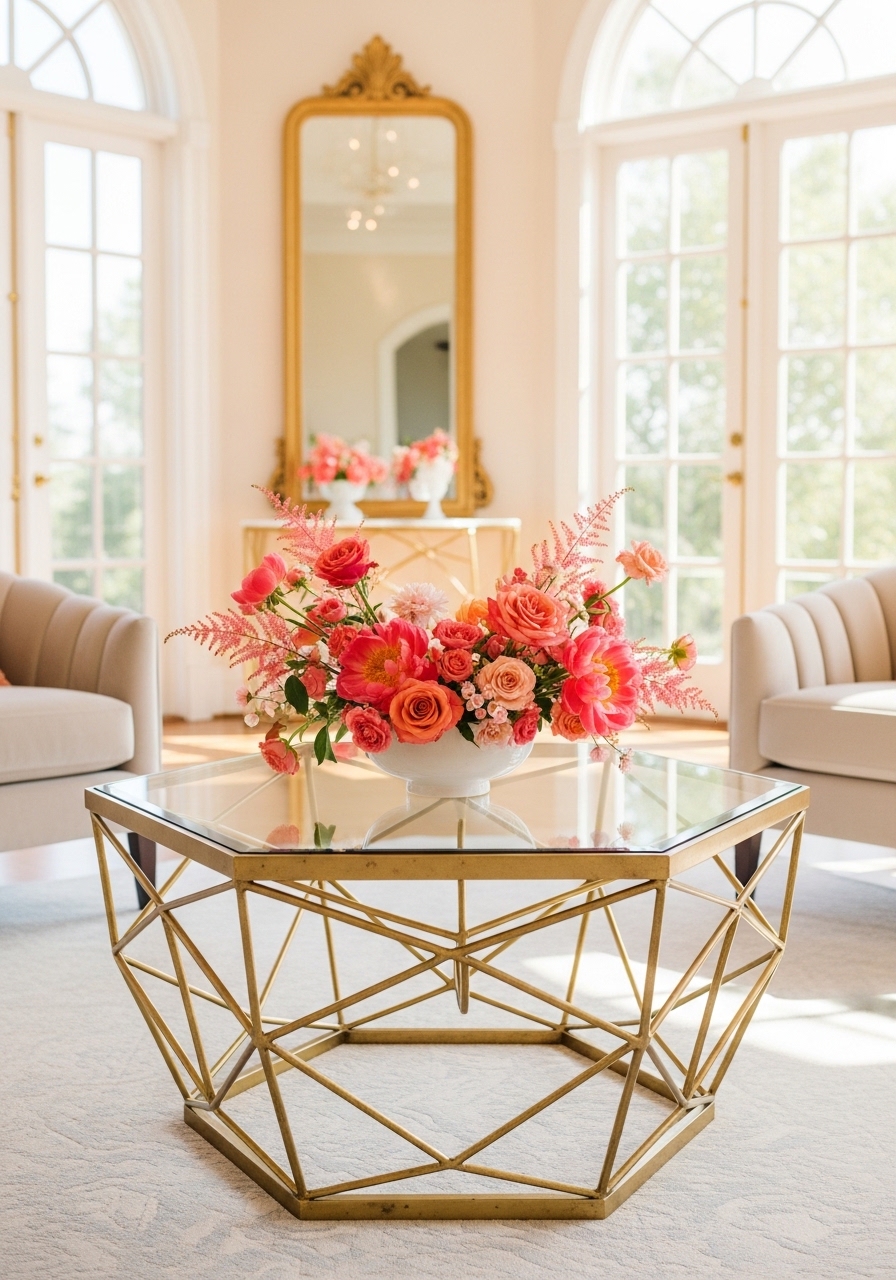 A gold-framed coffee table with a clear glass surface keeps your space feeling open and reflective. The transparency prevents heaviness, while the metallic base maintains the glamorous Neo-Deco aesthetic. Style the surface intentionally—two stacked design books, a structured floral arrangement, and a crystal tray are enough. Avoid clutter, as summer decor thrives on visual breathing room. The reflective metal catches sunlight beautifully, enhancing brightness throughout the room. This is especially effective in smaller spaces where maintaining openness is crucial.