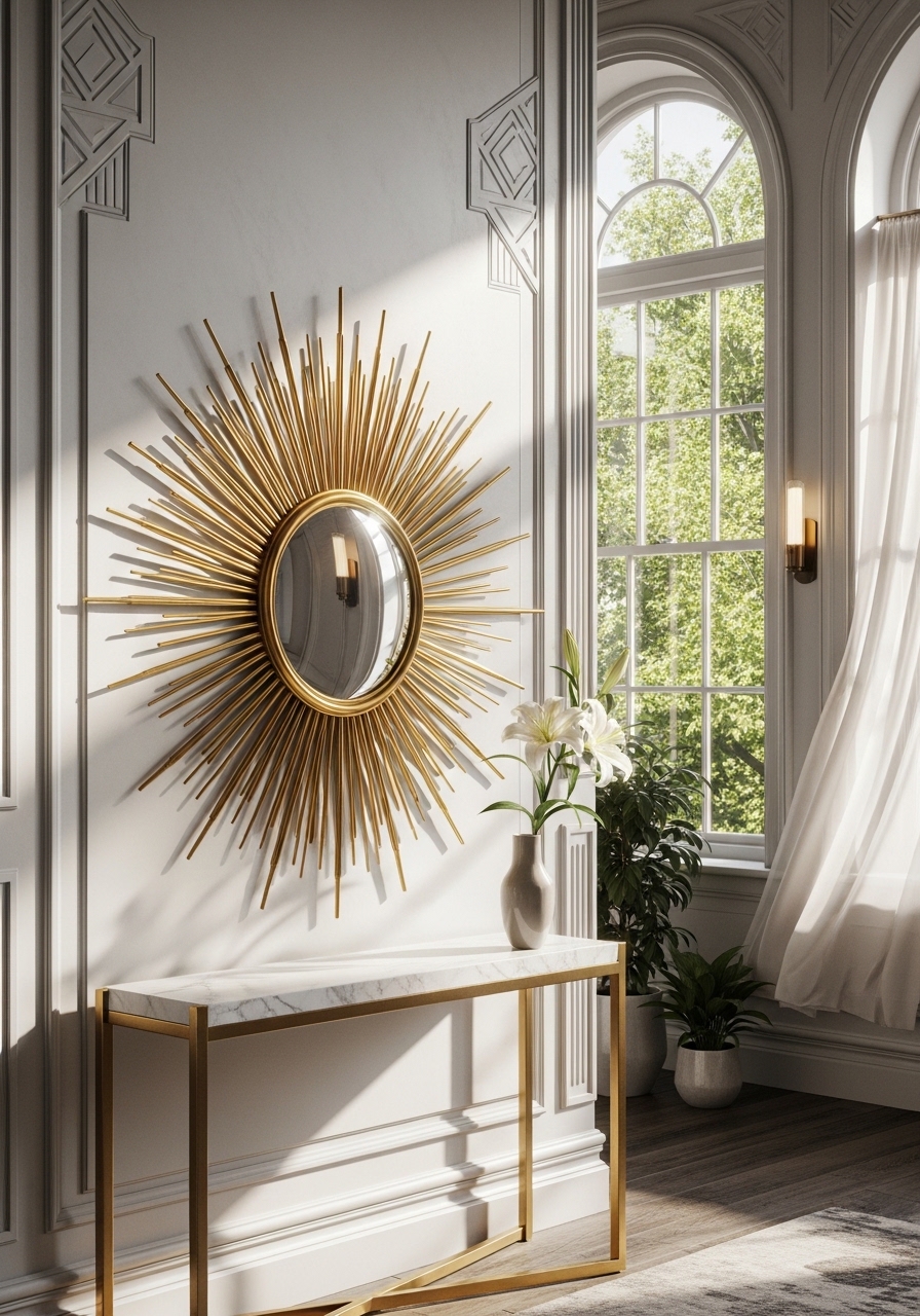 Elevating your home with a statement sunburst mirror is the ultimate way to infuse Summer Neo-Deco radiance into any room. To maximize this iconic silhouette, position the mirror directly opposite a window to capture and amplify natural light, creating immediate visual expansion. Opt for a brushed gold or warm metallic finish to reflect seasonal warmth without feeling overly heavy. To maintain a sophisticated focus, pair the mirror with a sleek marble console table and two symmetrical lamps, keeping surrounding clutter minimal. This strategic mirror placement transforms a simple wall into a brilliant focal point that feels both architecturally structured and vibrantly airy.