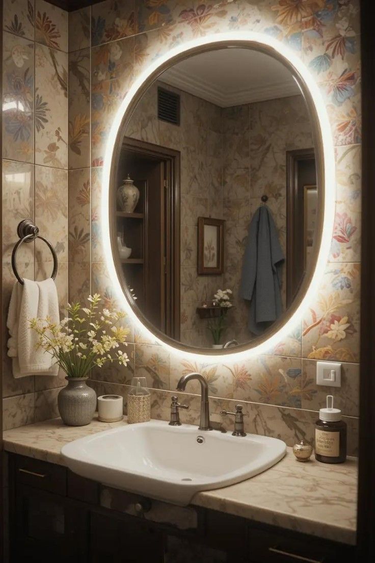 A statement mirror can become the focal point of a tiny bathroom while adding personality. Round mirrors, arched mirrors, or uniquely framed mirrors draw attention and create visual interest. When placed above a small vanity, they elevate the design without requiring extra space. Metallic frames such as brass or matte black add sophistication and contrast against light walls. Because mirrors reflect light, they also enhance brightness and openness. A bold mirror design proves that even a small bathroom can have a strong design identity.