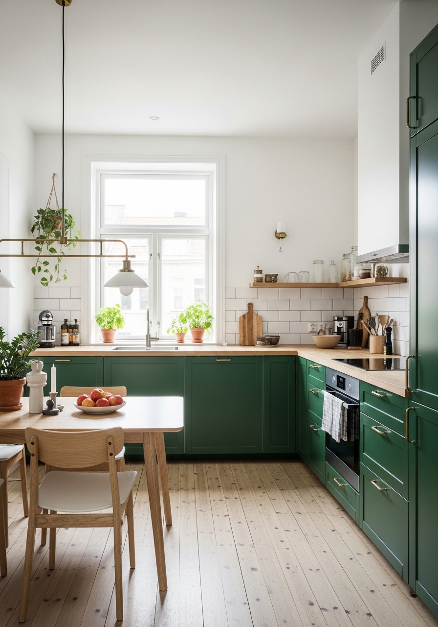 Combine emerald green cabinets with pale wood finishes and white walls for a Scandinavian-inspired look. The green adds depth while light woods keep the atmosphere airy. Choose simple hardware and functional layouts to stay true to minimalist principles. Introduce natural textiles like linen or cotton for softness. Keep décor understated and purposeful. This balance creates a kitchen that feels both bold and serene, offering warmth without sacrificing clean lines. Emerald green in Scandinavian design feels fresh, modern, and beautifully harmonious.