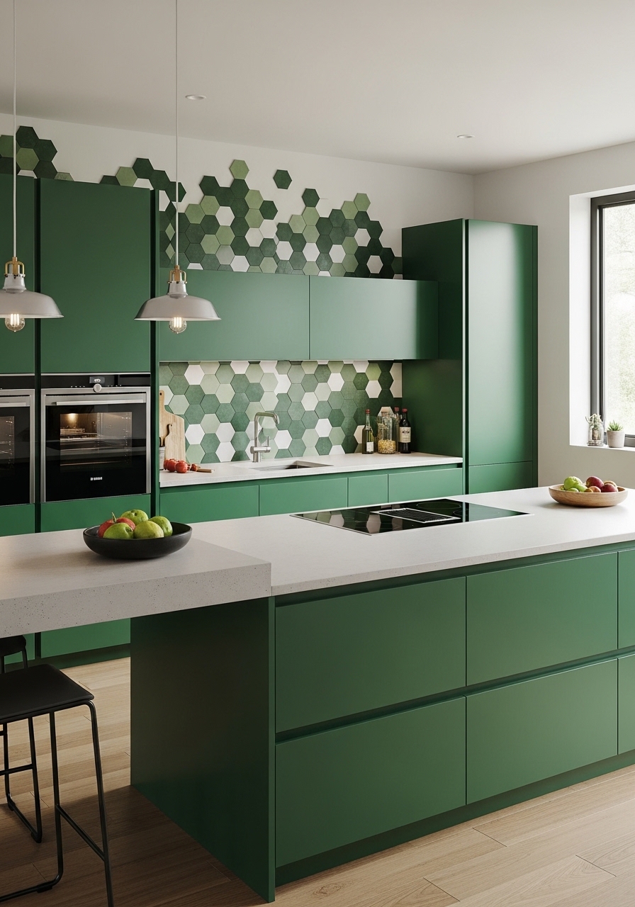 Pair emerald cabinets with geometric tiles or patterned backsplashes. Clean lines and bold shapes enhance the modern aesthetic. Keep surrounding elements simple to allow patterns to stand out. This design feels artistic and cutting-edge.