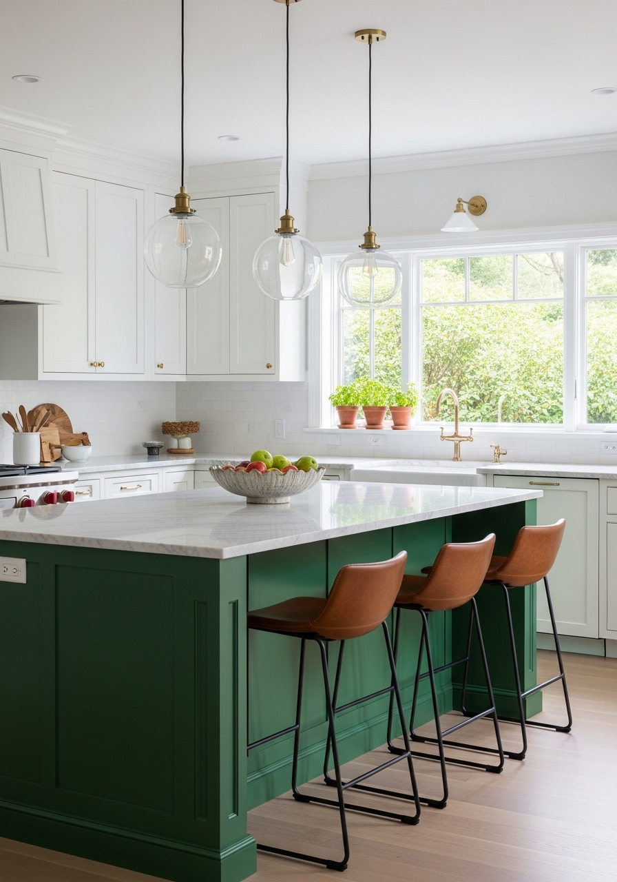 If committing to full emerald cabinetry feels bold, start with a kitchen island statement. Paint the island in a deep emerald shade while keeping surrounding cabinets neutral—such as white, beige, or light gray—for balance. This creates a stunning focal point without overpowering the room. Choose a contrasting countertop like white marble or light wood to enhance dimension. Add stylish bar stools in leather or woven textures to soften the richness. Pendant lights above the island should provide warm illumination, highlighting the green tones beautifully. This strategy delivers drama, personality, and elegance while maintaining a fresh, airy kitchen environment.