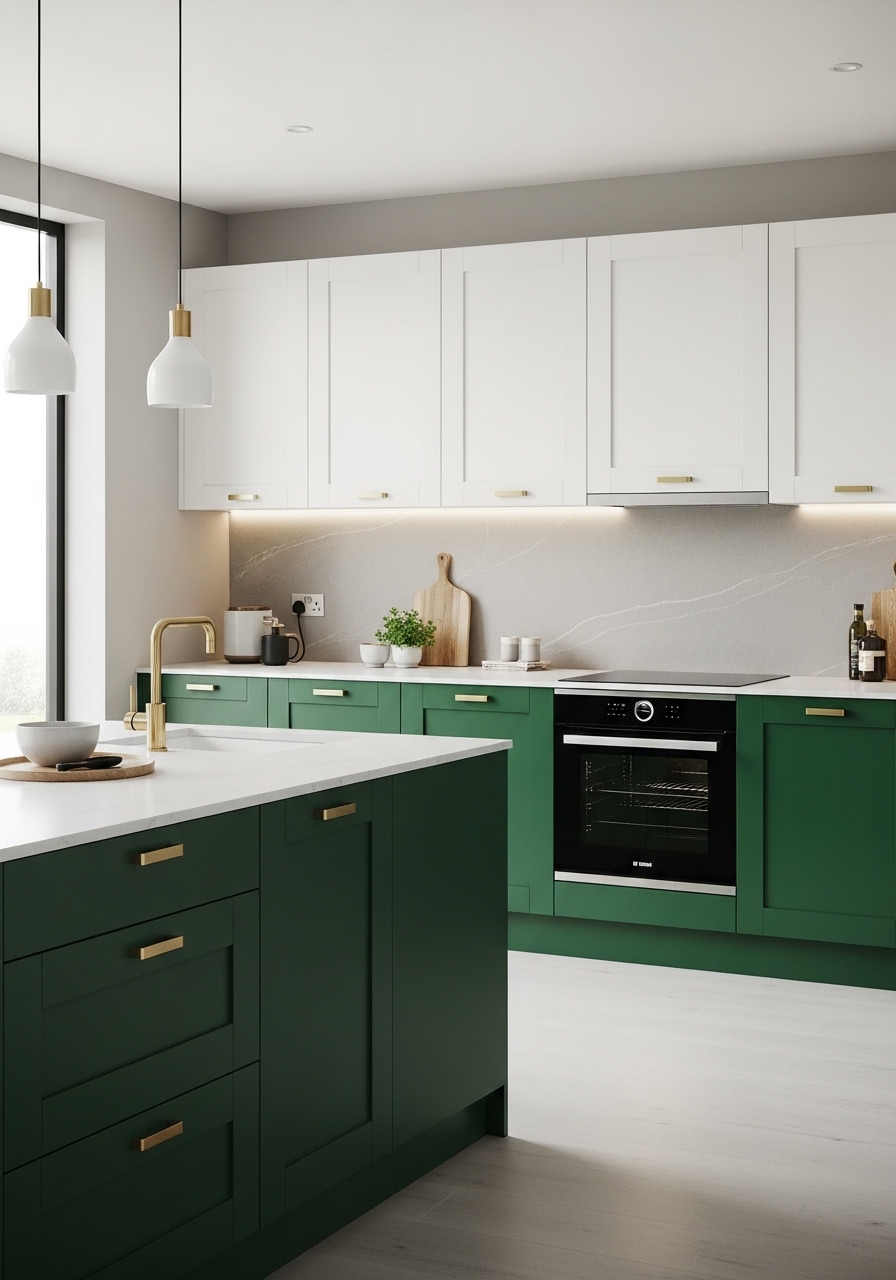 Two-tone kitchens offer depth and visual balance. Paint lower cabinets emerald green while keeping upper cabinets light—white or soft beige works beautifully. This prevents the room from feeling too dark while anchoring the space with richness below eye level. Choose coordinating hardware to tie both tones together, such as brushed gold or matte black. Add a neutral backsplash to unify the palette. The contrast creates a clean, structured look that feels modern yet inviting. Two-tone sophistication allows you to enjoy bold emerald green while maintaining brightness and openness throughout the kitchen.