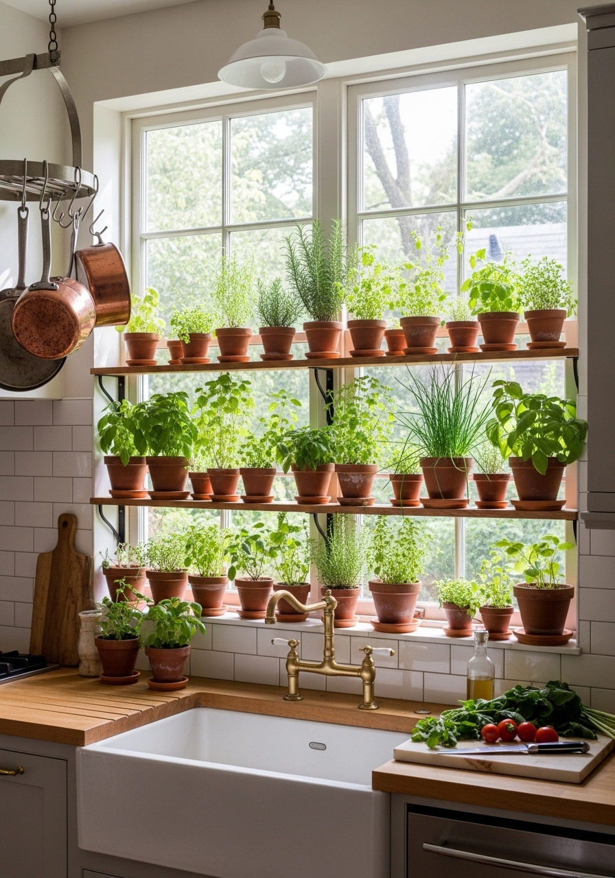 Bring the outdoors in with herb garden kitchen windows, a functional design feature that creates a living connection to nature while keeping fresh ingredients within reach. Positioned in natural light, these “culinary windows” allow herbs like basil, rosemary, and thyme to thrive, adding vibrant greenery and pleasant aromas to your cooking space. Whether you use terracotta pots for a Mediterranean feel or wooden planters for a rustic touch, window gardens provide a soft, organic contrast against neutral kitchen backgrounds. Utilizing tiered plant stands or hanging containers maximizes growing space, turning a simple window into an attractive focal point. Regular harvesting not only enhances your culinary experience but also promotes healthy plant growth, making your kitchen a true sanctuary for sustainable, farm-to-table living.