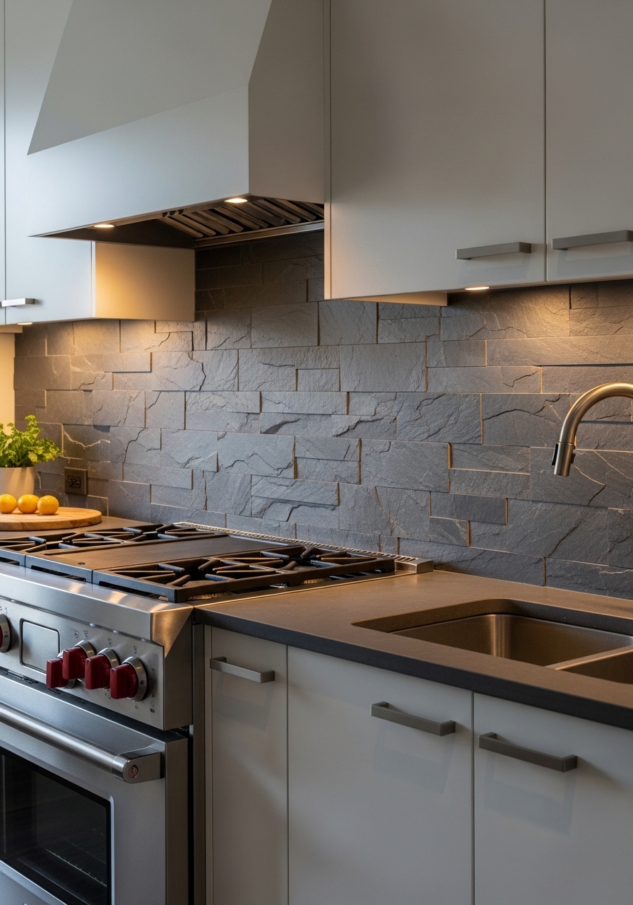Design a dramatic and sophisticated focal point with a natural slate kitchen backsplash, offering rich textures and deep, moody earth tones. Slate’s unique natural cleavage creates a layered, tactile surface that manufactured tiles cannot replicate, while its inherent heat resistance makes it ideal for the high-temperature zone behind your range. With a color palette spanning from charcoal gray to rustic copper and forest green, slate effortlessly complements both warm wood cabinetry and modern stainless steel appliances. Its dense, low-porosity nature makes it naturally resistant to water and steam, and when properly sealed, it provides a durable, easy-to-clean barrier against cooking splatters. Whether you choose a rugged natural cleft finish for a farmhouse look or a smooth honed surface for contemporary elegance, slate brings an authentic, enduring beauty to any earthy kitchen design.