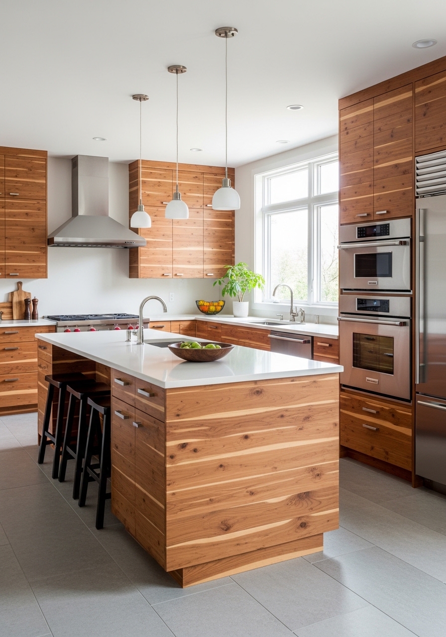 Embrace eco-friendly luxury with sustainable bamboo cabinetry, a rapidly renewable resource that combines modern durability with distinctive natural beauty. Bamboo’s quick growth cycle makes it an environmentally conscious alternative to traditional hardwoods, offering a strength that stands up to daily kitchen use. Available in shades ranging from natural blonde to rich caramelized tones, its fine grain adds a sleek, organic character to contemporary and transitional designs. Beyond its aesthetic appeal, bamboo possesses natural antimicrobial properties, making it a practical choice for a clean cooking environment. Whether you prefer solid boards or engineered panels, bamboo cabinetry aligns perfectly with sustainable living practices while providing a warm, functional foundation for your nature-inspired home.