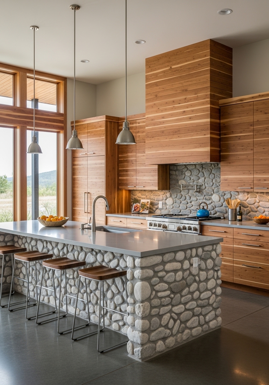 Add organic texture and a tranquil, water-worn beauty to your home with river rock kitchen features, a design element that celebrates the tactile appeal of natural stone. These smooth, rounded stones offer gentle curves and a diverse palette of earth tones—from cool slate grays to warm ochres—creating a sophisticated connection to the outdoors. In 2026, designers are using river rock for tactile backsplashes and accent walls to soften the sharp, industrial lines of modern appliances. Whether installed as a flat, polished mosaic for easy cleaning or left in a three-dimensional “stacked” arrangement for maximum visual depth, river rock pairs perfectly with reclaimed wood and matte black fixtures. Each installation is a unique work of art, providing a grounding, Zen-like atmosphere that transforms your kitchen into a soothing natural retreat.