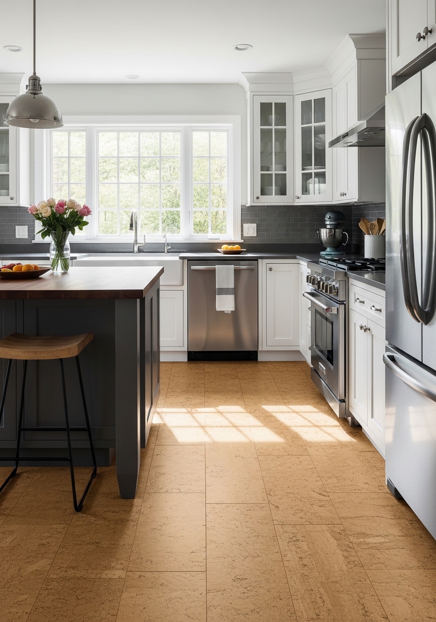 Select sustainable cork kitchen flooring for a high-performance foundation that balances eco-consciousness with unparalleled comfort. In 2026, cork has surged in popularity as a “wellness material” due to its honeycomb cellular structure, which provides natural shock absorption to reduce fatigue during long cooking sessions. This renewable bark-based flooring is naturally antimicrobial and hypoallergenic, containing suberin to resist mold, mildew, and pests without chemical treatments. Cork also acts as an exceptional thermal and acoustic insulator, keeping your kitchen quiet and warm underfoot even in winter. Available in a spectrum of 2026-trending tones—from airy natural honey to deep, saturated chestnut stains—cork offers a tactile, matte finish that grounds modern organic and Mediterranean designs while supporting superior indoor air quality.