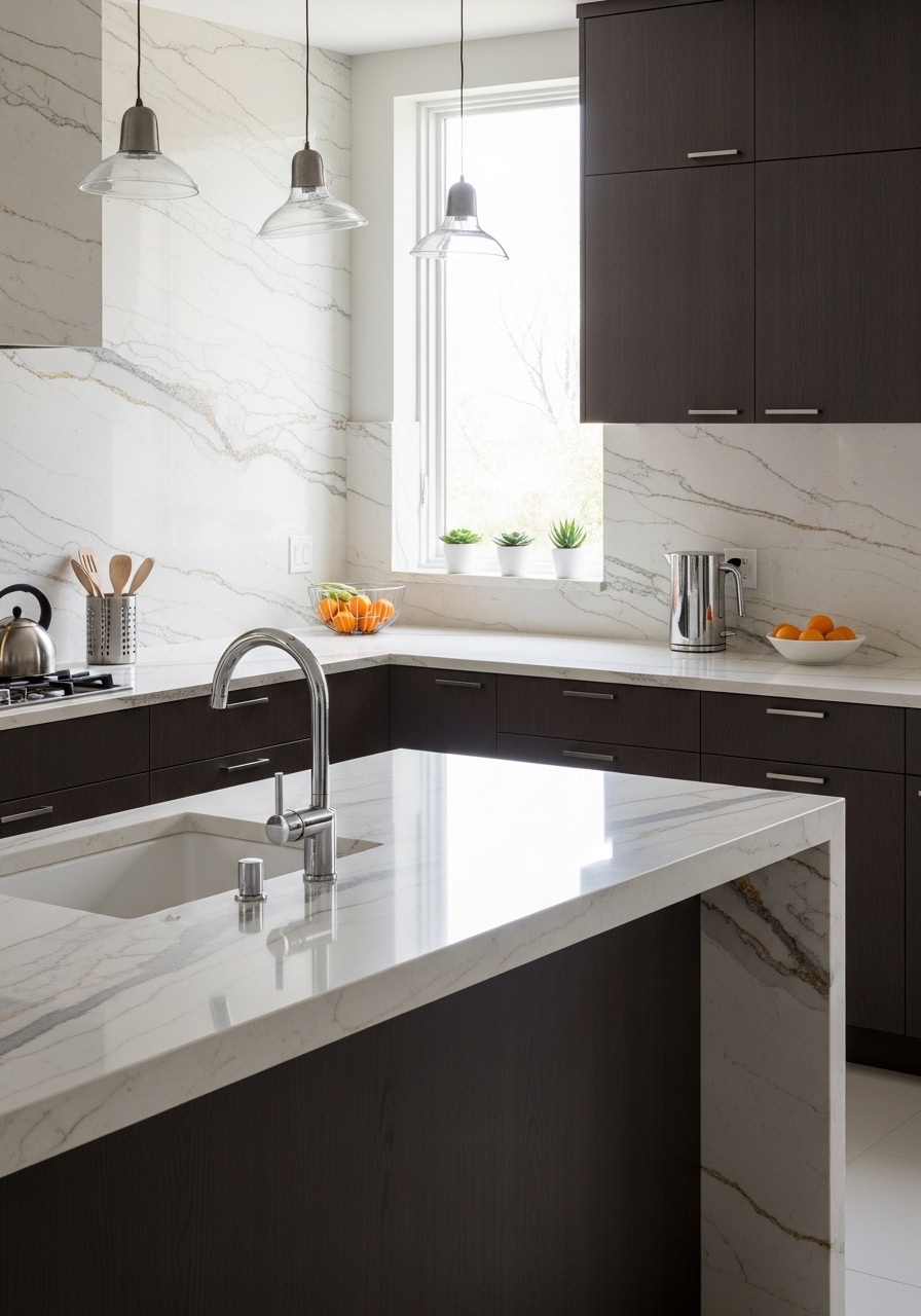 Incorporate luxurious quartzite kitchen surfaces for a high-performance foundation that blends the ethereal beauty of marble with the rugged strength of granite. As a natural metamorphic rock, quartzite offers a level of heat and scratch resistance that outshines engineered alternatives, making it the premier choice for 2026’s high-traffic “chef’s islands.” Each slab is a geological masterpiece, featuring crystalline depth and “watercolor” veining that cannot be replicated. While white remains a staple, 2026 trends are shifting toward specialty character slabs—think deep forest greens, desert golds, and even moody blues. When finished with a modern leathered or honed texture, quartzite provides a tactile, matte elegance that hides fingerprints and reflects the sophisticated, organic spirit of a nature-inspired kitchen.