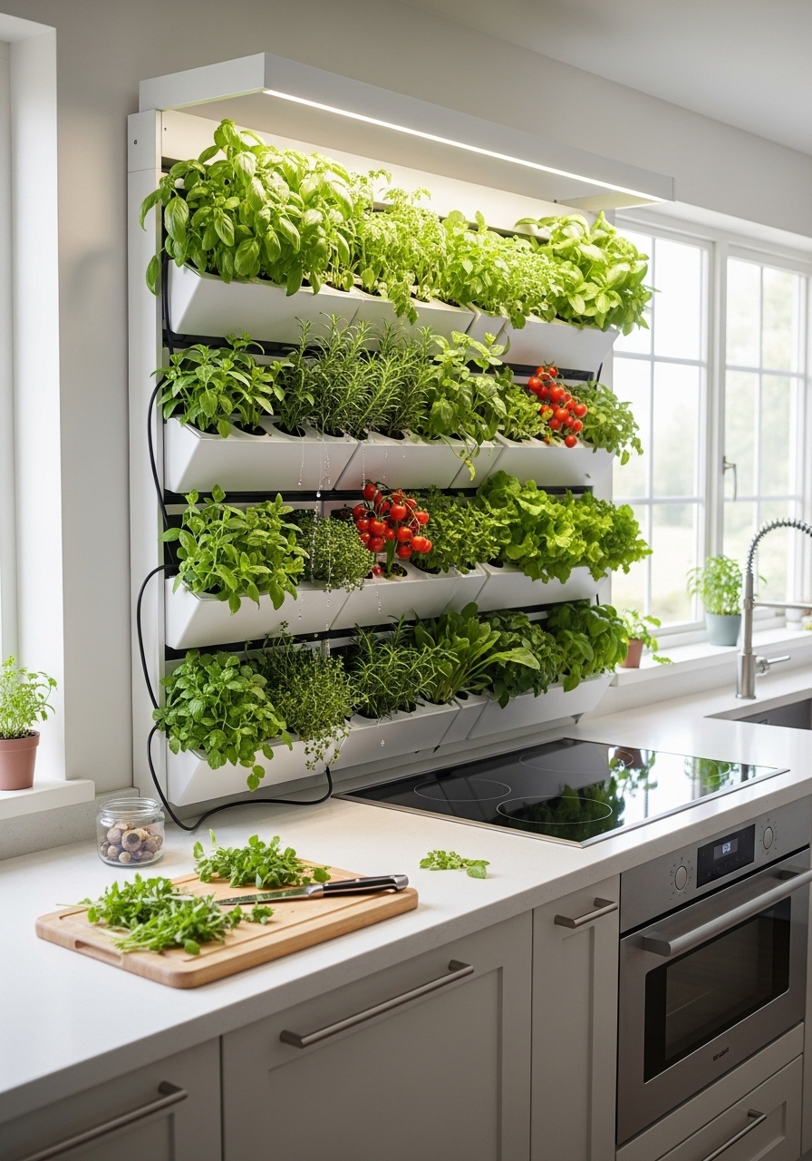 Create a vibrant, oxygen-rich sanctuary with living wall kitchen gardens, a pinnacle of 2026 biophilic design that turns vertical surfaces into productive “edible art.” These systems utilize space-saving modular panels to grow fresh herbs, microgreens, and leafy vegetables directly on your kitchen walls, maximizing yield in compact urban floor plans. Equipped with integrated smart irrigation and app-controlled LED grow lights, modern living walls take the guesswork out of indoor farming by automatically regulating moisture and light cycles. Beyond their culinary utility, these vertical forests act as a natural air filtration system, scrubbing VOCs and regulating humidity to enhance the well-being of everyone in the heart of the home.