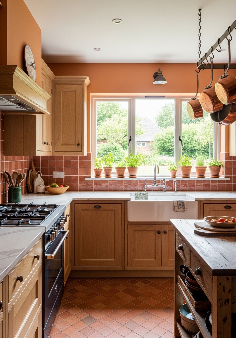 Infuse your home with Mediterranean warmth using terra cotta kitchen color schemes, a vibrant yet grounding choice for nature-inspired interiors. Ranging from soft peach to deep reddish-brown, this earthy palette creates an inviting, sun-baked atmosphere that pairs beautifully with cream, sage green, and deep navy accents. Incorporating terra cotta tiles or painted cabinetry adds artisanal charm, especially when complemented by copper fixtures and natural wood textures. This “baked earth” aesthetic bridges the gap between rustic tradition and modern organic style, providing a sophisticated backdrop for gatherings. Whether through hand-painted ceramics or bold accent walls, terra cotta transforms your kitchen into a cozy, high-energy sanctuary.