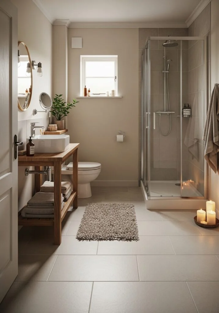 Large tiles surprisingly work better than small tiles in compact bathrooms because they reduce the number of grout lines. Fewer grout lines create a smooth, continuous surface that visually enlarges the floor area. Light-colored porcelain or marble-look tiles are especially effective for reflecting light and enhancing openness. Extending the same tile pattern from the floor into the shower area also creates a seamless design that makes the room feel larger and more cohesive.