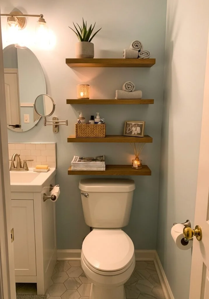 Open shelving helps maximize storage while keeping the bathroom visually light and uncluttered. Instead of bulky cabinets that can overwhelm a small space, floating shelves allow you to store everyday items in a more accessible way. Folded towels, decorative baskets, and glass jars can turn simple storage into attractive displays. This approach also encourages better organization because items remain visible and easy to reach. Open shelves work especially well above toilets or beside mirrors where unused wall space exists. With thoughtful styling and minimal decor, open shelving can become both a functional storage solution and a decorative element that enhances the overall bathroom design.