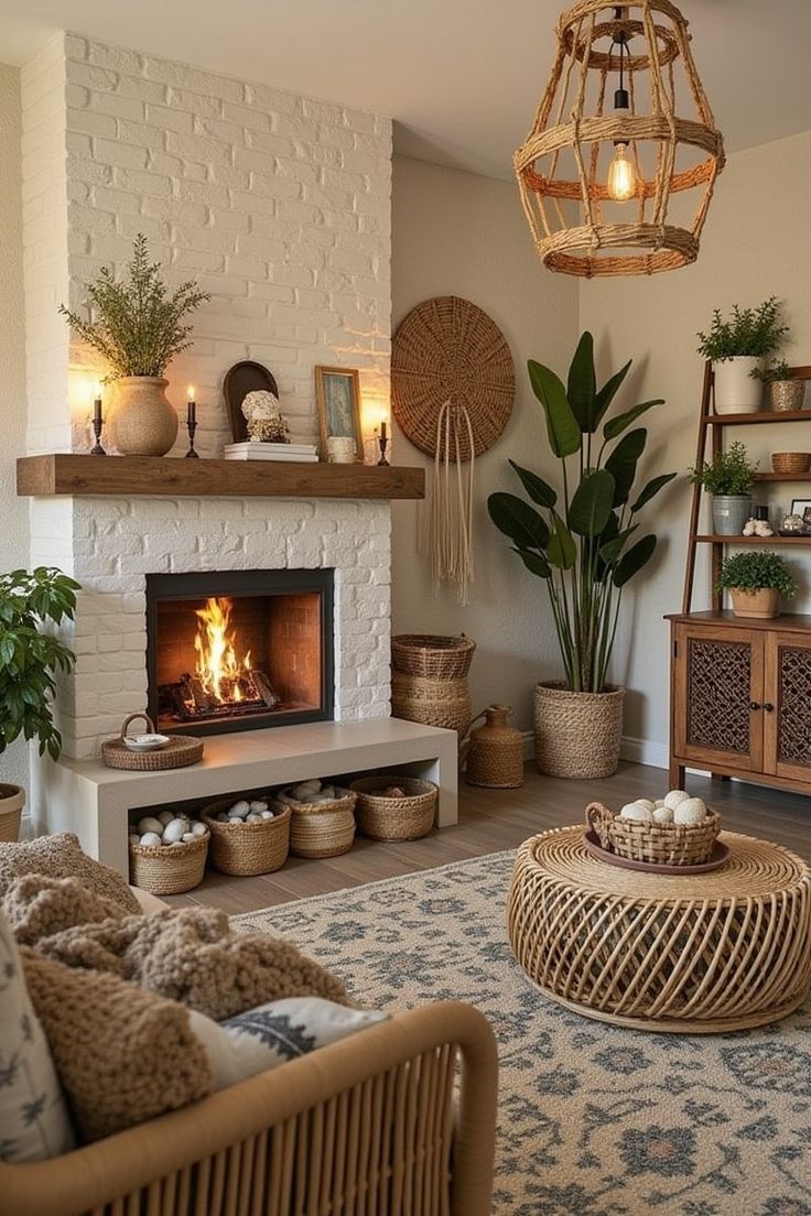 Breathe new life into tired brick with a coat of white paint. This cost-effective update brightens rooms, maintains original texture, and forms the perfect backdrop for farmhouse décor. High-quality masonry paint ensures durability, while reclaimed wood mantels add warmth and character. Complete the look with firewood storage, vintage accessories, and soft furnishings to achieve cozy, countryside charm that welcomes family and guests.