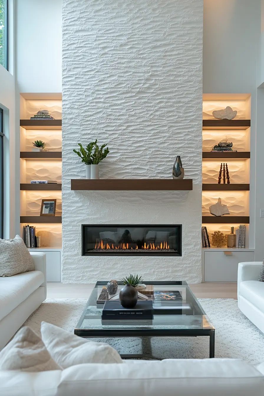 Combine style with functionality by integrating flanking cabinets or open shelving around your white fireplace. This creates a unified focal wall while maximizing storage for books, décor, and media equipment. Matching white tones ensure seamless integration, while subtle hardware finishes add sophistication.