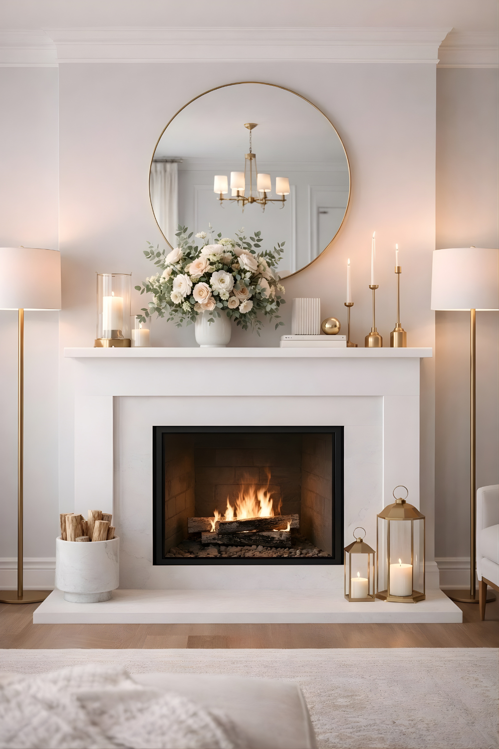 For timeless elegance, choose an ornate white mantel with crown molding and carved details. This classic design adds visual weight and architectural sophistication while offering ample display space for art, mirrors, or seasonal décor. Works beautifully with marble, tile, or painted brick surrounds, instantly elevating any living area with refined style.