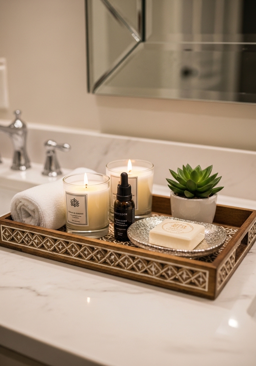 A simple decorative tray can transform everyday toiletries into a styled display. Place a tray on the vanity to organize soap dispensers, perfumes, candles, and skincare products. This small styling trick keeps surfaces neat while adding elegance. Choose materials like marble, wood, or glass to match your bathroom’s theme. Trays create a curated look that feels intentional rather than cluttered, making the bathroom appear more refined and thoughtfully arranged.