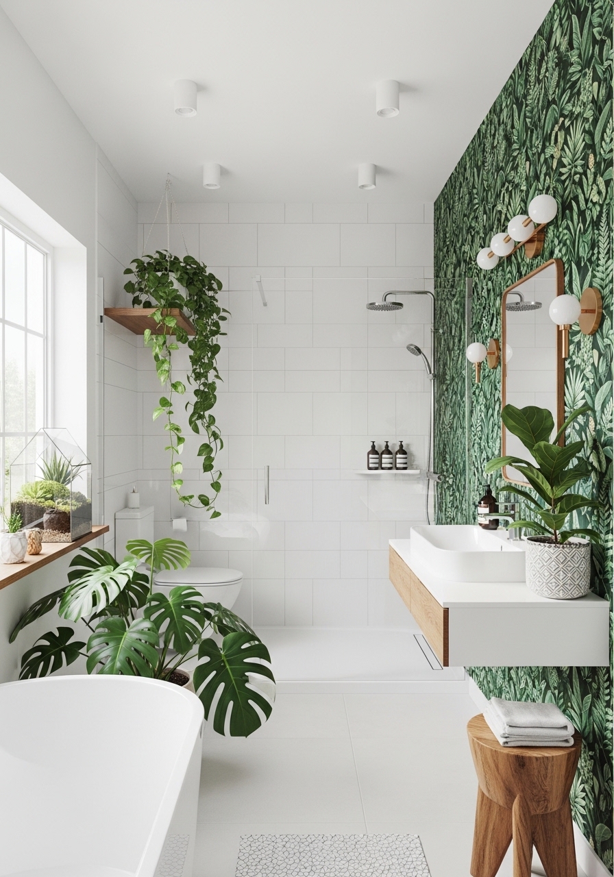 Natural materials instantly make a bathroom feel calming and inviting. Add wooden shelves, stone sinks, woven baskets, or bamboo accessories to introduce texture and warmth. Plants such as ferns or pothos thrive in humid environments and bring life to the room. These organic touches soften hard surfaces like tile and glass, creating a balanced and relaxing environment. Nature-inspired decor is one of the most popular interior design trends because it promotes wellness and tranquility while keeping the space visually interesting and cozy.