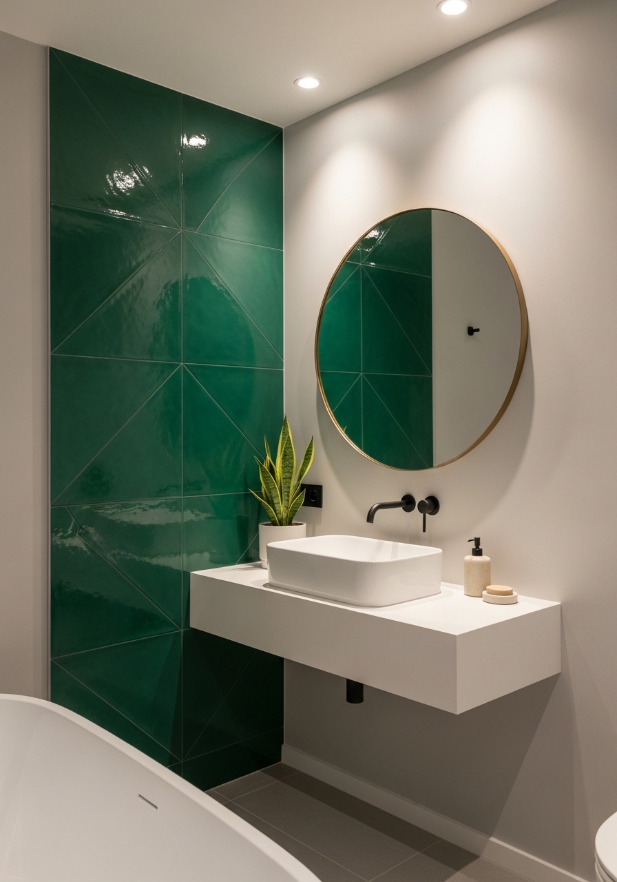 An accent wall adds personality and depth to a bathroom without overwhelming the entire space. Consider patterned tiles, textured stone, or waterproof wallpaper behind the vanity or bathtub. Deep colors like navy, forest green, or charcoal create dramatic contrast against lighter elements. Accent walls act as a visual centerpiece that elevates the overall design while maintaining balance. This idea works especially well in modern bathrooms where minimal decor allows bold surfaces to stand out beautifully.