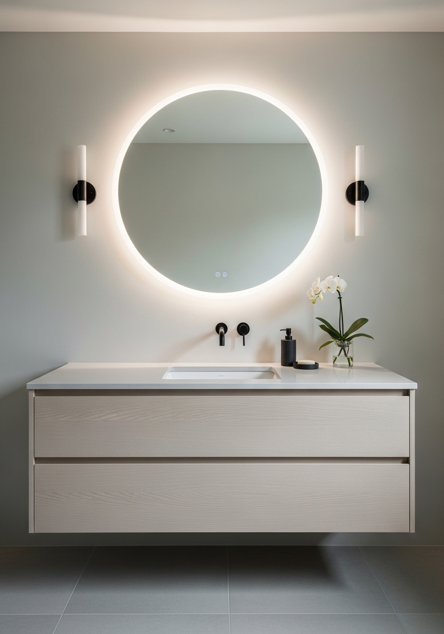 A backlit mirror adds both function and drama to your bathroom design. The LED lighting behind the mirror creates a soft halo effect that feels modern and luxurious. This lighting is perfect for daily grooming tasks because it provides even illumination without harsh shadows. Backlit mirrors also act as a stylish design element that instantly upgrades a plain vanity area. They work beautifully in contemporary bathrooms and help create a spa-like environment. Combined with minimal decor and clean surfaces, a glowing mirror can turn a simple bathroom into a sleek and visually striking modern retreat.