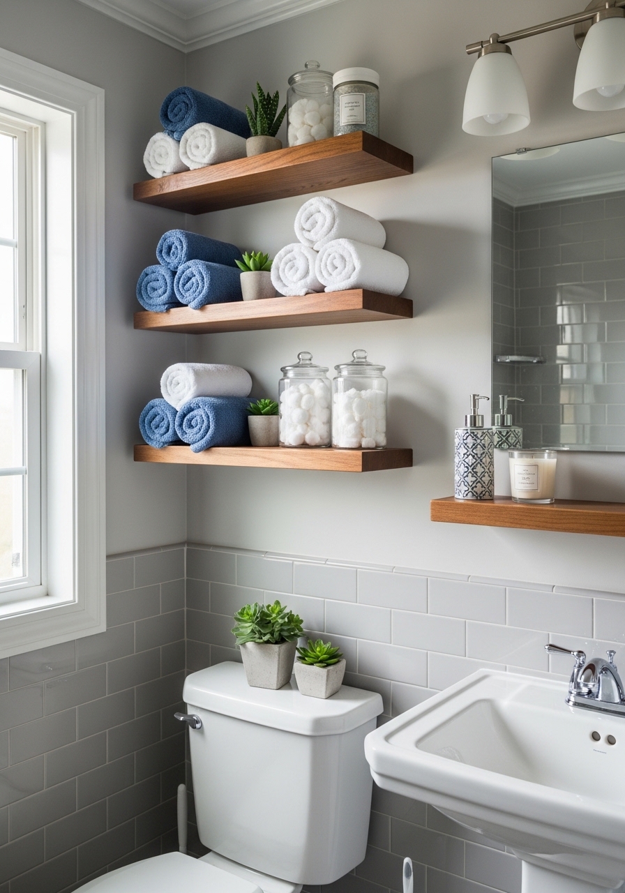 Open shelving adds both storage and decorative opportunities. Floating shelves above the toilet or beside the vanity allow you to display folded towels, candles, small plants, and stylish containers. This approach keeps everyday items accessible while contributing to the overall design. Choose wood shelves for warmth or sleek metal brackets for a modern touch. Styling shelves with carefully selected decor can transform a plain bathroom wall into a visually appealing design feature that feels curated and personal.