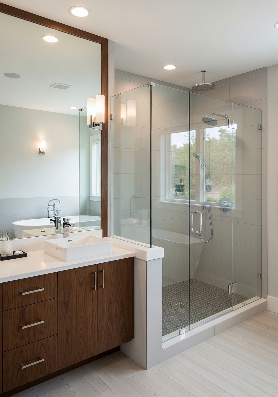 Glass shower enclosures are one of the easiest ways to make a bathroom feel bigger and brighter. Unlike shower curtains or bulky frames, clear glass panels allow light to flow through the entire space. Frameless glass designs look especially sleek and modern. They highlight beautiful tile work while maintaining a clean, open appearance. This upgrade is ideal for small bathrooms because it eliminates visual barriers and creates a seamless look. Glass showers are commonly used in luxury bathrooms because they combine practicality with sophisticated design, making the entire room feel more spacious and polished.