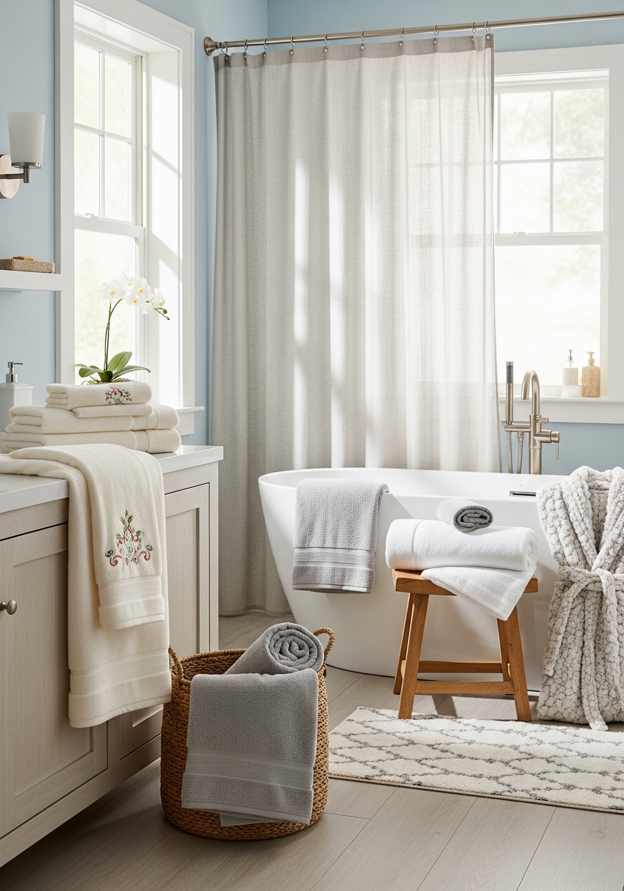 Soft, high-quality towels can instantly elevate a bathroom’s look and comfort. Choose plush cotton towels in neutral tones like white, cream, or soft gray for a luxurious spa feeling. Coordinated bath mats and hand towels create a cohesive appearance. Rolled or neatly folded towels displayed on shelves also become decorative elements. Investing in beautiful textiles improves everyday comfort while contributing to a polished bathroom aesthetic that feels welcoming and well-designed.