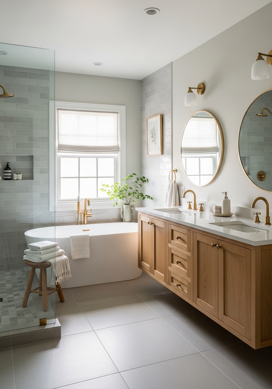 A freestanding bathtub instantly brings luxury and elegance to any bathroom. Its sculptural shape becomes the centerpiece of the room, creating a spa-like atmosphere. Position it near a window if possible to enhance the relaxing experience with natural light. Pair it with a floor-mounted faucet for a sophisticated look. Even in medium-sized bathrooms, a carefully chosen tub can elevate the entire design and make the space feel like a high-end retreat.