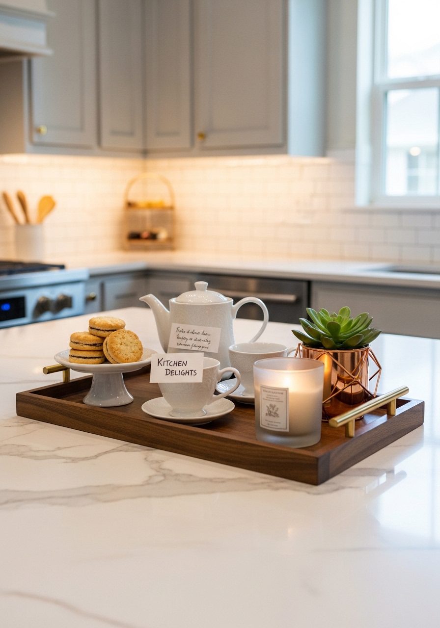 Grouping items on a decorative tray organizes your countertop while adding a visually appealing styling element. Trays can hold oils, spices, coffee essentials, or small decor items, making daily use effortless and intentional. Using trays prevents clutter by containing items in a defined area, creating a sense of order while also adding texture and color. Choosing materials like marble, wood, or metal enhances the aesthetic appeal and complements other design elements. This technique allows small accents to become part of the decor, subtly elevating the kitchen’s style. Decorative tray styling balances function and beauty, transforming ordinary items into curated moments that enhance the room’s overall visual interest.