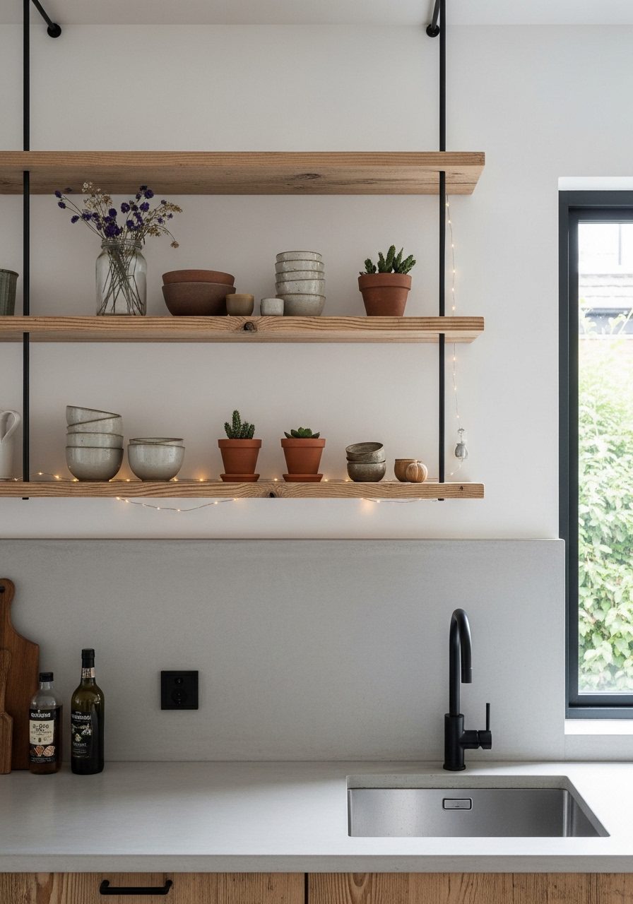 Open shelving allows you to display curated items like ceramics, glassware, and cookbooks while keeping the space airy and organized. Minimal styling prevents clutter and creates a clean, sophisticated look that feels intentional. Neutral tones or cohesive color schemes ensure shelves complement rather than overwhelm the kitchen. Open shelving highlights decorative pieces and everyday items, making them part of the overall design narrative. Carefully balancing open and closed storage maintains functionality while achieving aesthetic appeal. By mixing textures, heights, and materials, you add visual depth. This approach works well in kitchens of all sizes, giving small spaces an open feel and larger kitchens a curated charm. Minimal open shelving adds character, encourages thoughtful styling, and creates a visually inviting kitchen that feels approachable yet polished.