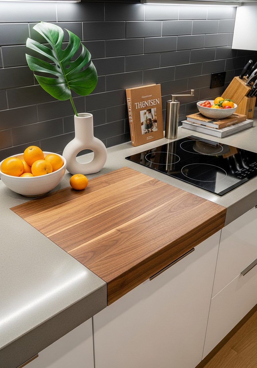 Countertop styling is both functional and decorative when using mixed materials. Combining wood cutting boards, marble trays, ceramic containers, and glass jars adds contrast, texture, and visual interest. This method avoids a sterile, uniform appearance while keeping essentials accessible. Carefully curating the arrangement ensures the counter feels intentional, balancing practical tools with aesthetic appeal. Mixed materials create layers that catch light differently, highlighting the textures of natural wood, polished stone, and ceramics. The arrangement also introduces warmth and softness to otherwise hard surfaces, making the kitchen feel lived-in yet polished. Layering materials is perfect for small touches, like placing herbs or utensils on a tray with a decorative vase, elevating everyday items into subtle décor. This styling approach combines beauty and functionality, giving your kitchen a curated, cohesive, and engaging look that feels luxurious but natural.
