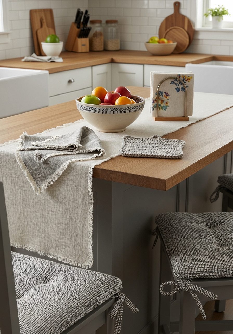 Incorporating soft textiles like rugs, curtains, or cushioned seating adds warmth and comfort to your kitchen, balancing hard surfaces like stone, metal, and tile. A well-chosen runner or small area rug can define a workspace or pathway while introducing texture and pattern. Curtains or blinds soften natural light, creating a gentle, inviting atmosphere. Cushions on chairs or stools provide practical comfort while enhancing the aesthetic appeal. Layering textiles in neutral shades or subtle patterns ensures cohesion with other design elements. These textures also prevent the space from feeling sterile or overly minimalist, making the kitchen feel lived-in and approachable. Even small additions like linen hand towels or decorative cloths contribute to this layered, cozy effect. Incorporating textiles thoughtfully transforms the kitchen from a purely functional room into a warm, inviting space that feels luxurious and stylish yet entirely practical.