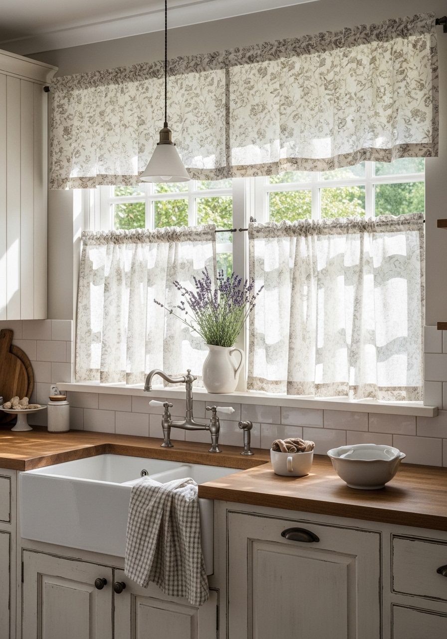Light, airy curtains or shades soften sunlight and bring warmth into the kitchen. Window treatments provide texture, pattern, and a sense of completion to the room. They can also help control light and privacy, adding both function and style. Choosing subtle colors ensures cohesion with cabinetry and countertops. Soft fabrics and flowing designs introduce movement, preventing the space from feeling sterile or rigid. Well-styled windows enhance natural light, framing views and creating an inviting atmosphere. Thoughtful window treatments add personality, softness, and a finished look, making your kitchen feel balanced, warm, and stylish.