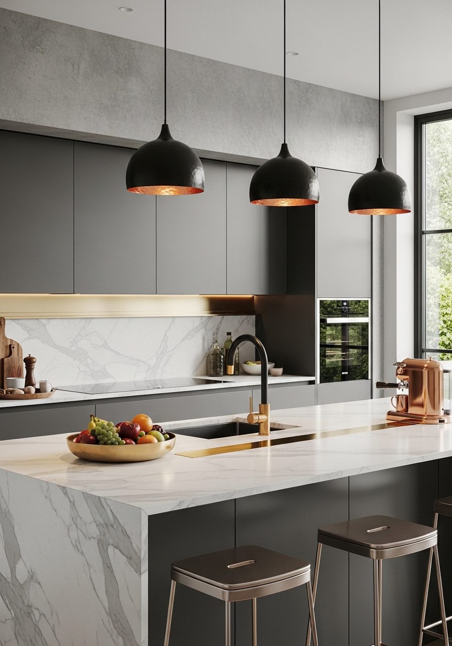 Incorporating metallic accents adds sophistication and a hint of luxury to your kitchen without overwhelming the design. Elements like brass handles, gold faucets, or stainless steel accessories catch the light and create dimension. Subtle metallic touches can be paired with neutral palettes for a cohesive look or layered with contrasting textures like wood or marble for depth. Metallics also tie together other elements like lighting, hardware, and decor pieces, creating a unified aesthetic. Even small details like metallic utensil holders or decorative bowls contribute to an elevated feel. When applied thoughtfully, these accents enhance the visual richness and professionalism of the kitchen, giving it a polished, stylish, and modern atmosphere.