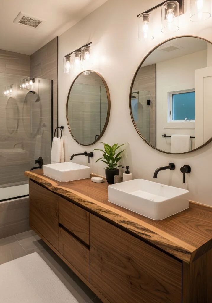 A large mirror is one of the easiest ways to make a bathroom look instantly luxurious. Oversized mirrors reflect light across the room, making the space appear brighter and more spacious. Choose a mirror with a decorative frame in brushed gold, matte black, or antique brass to add elegance. Round and arched mirrors are especially popular because they soften the look of hard bathroom surfaces like tile and stone. When placed above a vanity, a statement mirror becomes the visual centerpiece of the room, creating a designer feel that instantly elevates even the simplest bathroom layout.