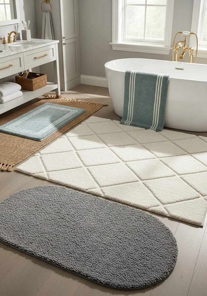 Textiles play an important role in making a bathroom feel warm and luxurious. Instead of using a simple bath mat alone, consider layering a stylish rug beneath or near the vanity. Soft cotton rugs, vintage-inspired runners, or woven textures instantly make the space feel cozy and curated. Neutral tones work well in modern bathrooms, while patterned rugs can add personality to minimalist designs. This simple styling trick brings warmth to tile floors and makes the room feel more comfortable and inviting.