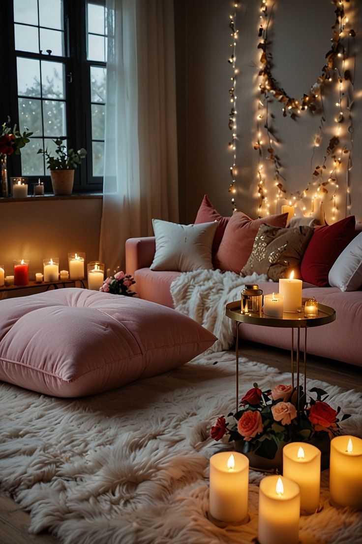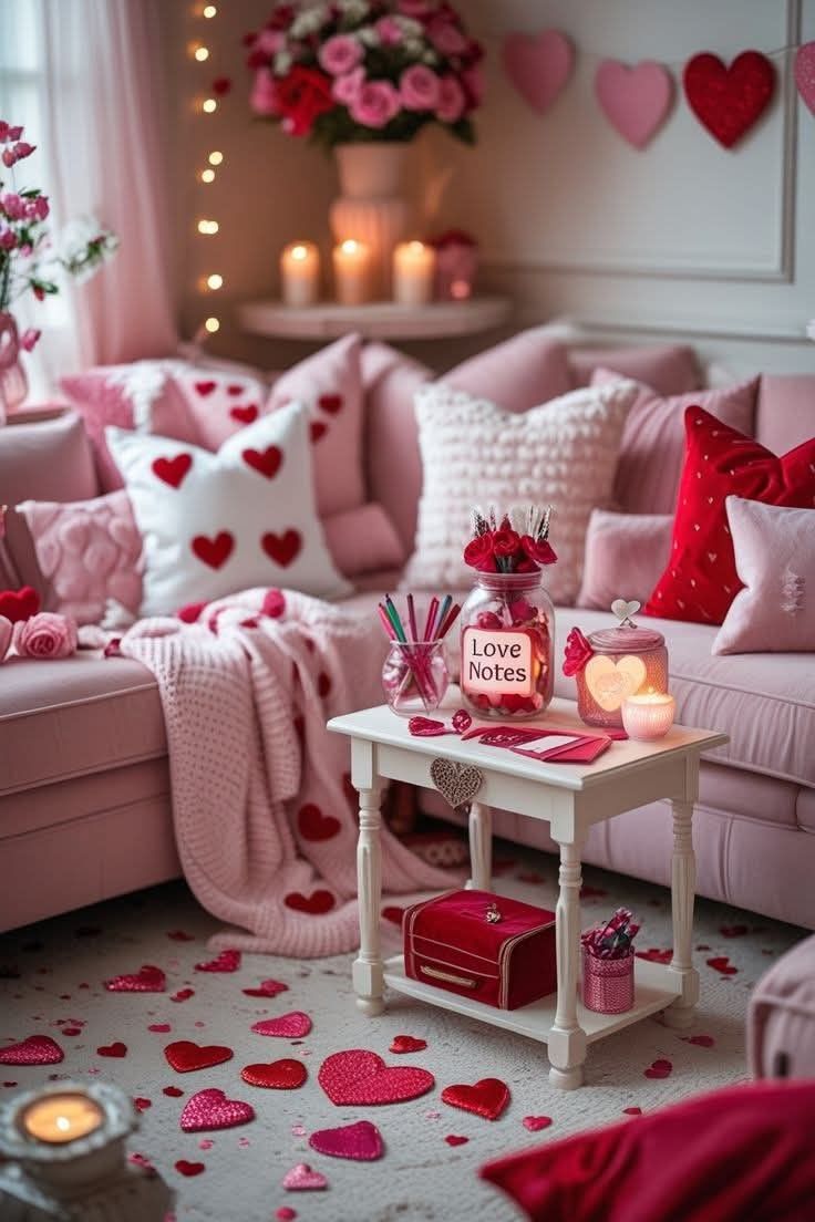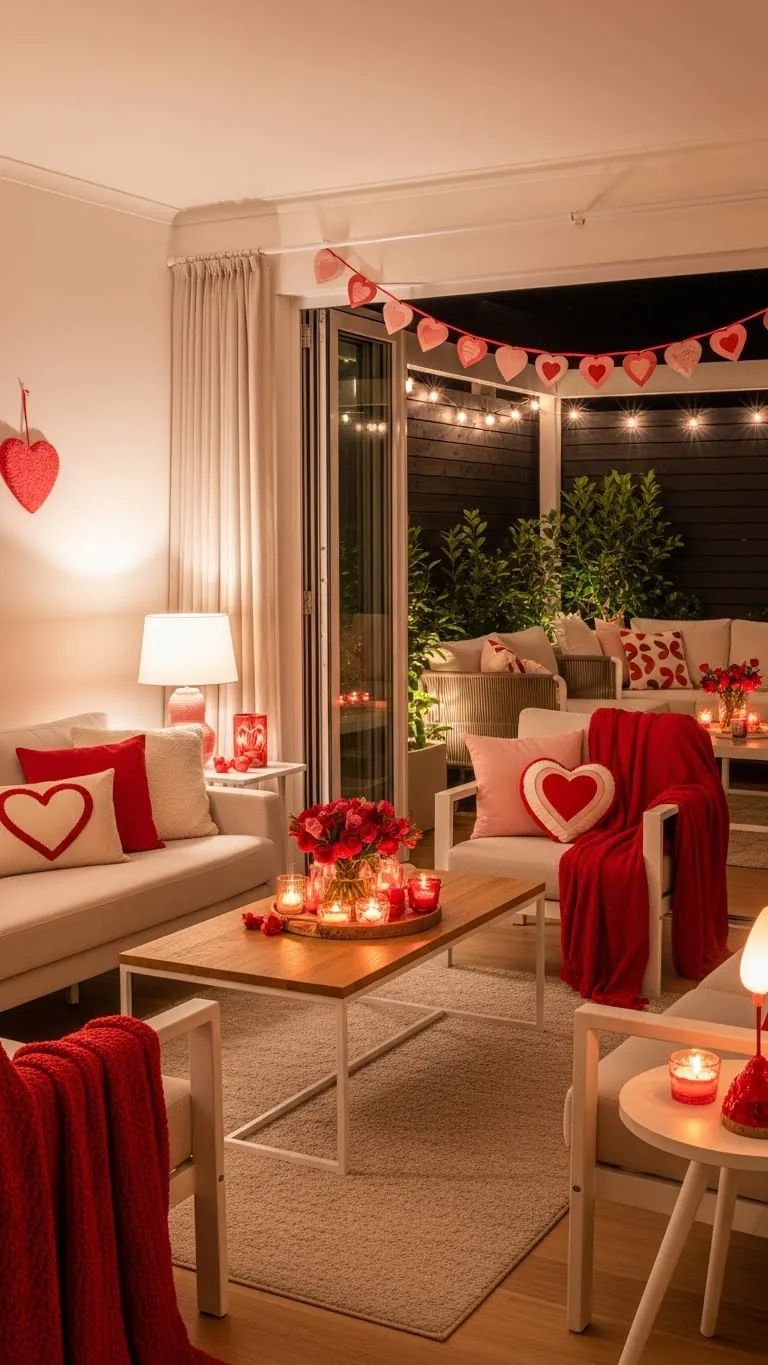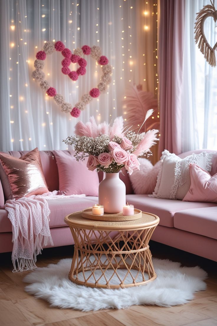 To keep the look intentional, choose one main pink tone and build around it with neutrals like beige or white. Add a small side table with candles or flowers for balance. This approach solves the problem of over-decorating while still creating a romantic Valentine’s atmosphere that feels inviting, functional, and easy to maintain.