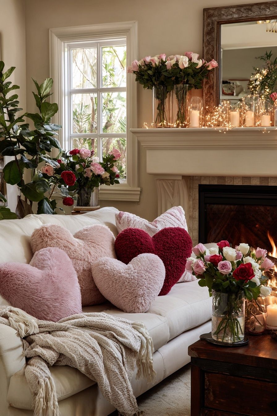 Adding soft blush accents to your living room is one of the easiest ways to decorate for Valentine’s Day without committing to bold changes. Blush pink throw pillows, cozy knit blankets, and subtle heart-shaped décor instantly create a romantic atmosphere while keeping the space elegant. This approach works perfectly for neutral living rooms and helps homeowners avoid the problem of overly seasonal décor that feels cluttered.